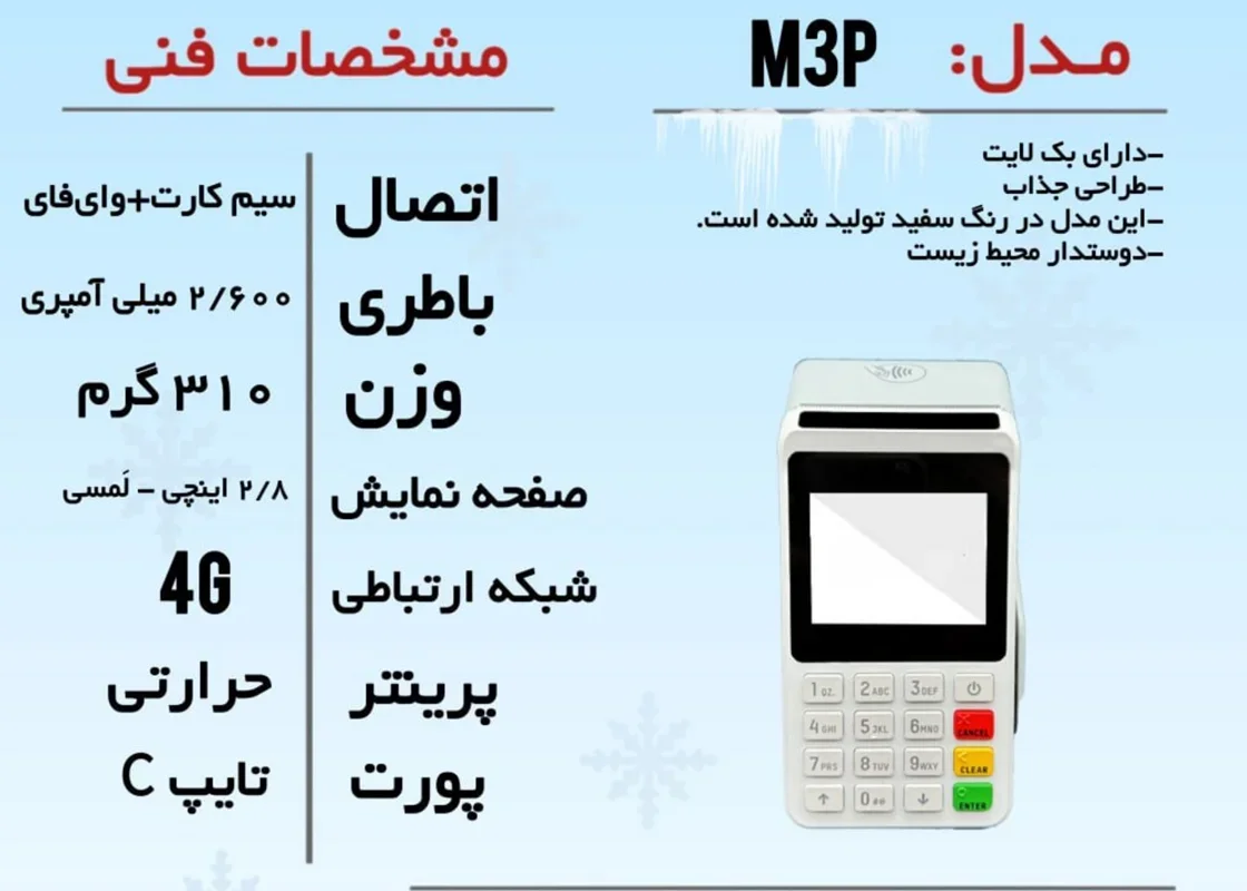 کارتخوان سیار ایرانی topwise M3P، یک محصول با تمامی امکانات به شمار می رود؛ topwise M3P با سییسم عامل اندروید و کارت حافظه داخلی 128M، دارای تراشه 4 هسته ای آرم کرتکس A35 است که دارای یک کارت مغناطیسی، اسمارت کارت (دارای چیپ) و یک کارت بدون حافظه ( NFC) می باشد، همچنین ویژگی منحصر به فردی که این دستکاه را از سایر دستکاه های سیار متمایز ساخته است.